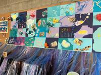 「エリア1 アクアリウム」では、手形・足形や、紙粘土を握ったり、引っ張ったりしてできた海の生き物たち、お花紙を握ってできた海藻が集合しました。のぞいたり、触ったり、スイッチを押すと電球が光ったりして体験もできる展示となりました。