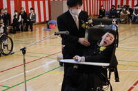 高崎経済大学より、実習生が来校し介護等体験が行われました。Ⅳ課程では、体育の授業に見学・参加し、交流を深めました。じゃんけん列車では、出す札を友達や実習生と相談しながら、対戦を楽しみました。