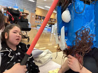 「エリア1 アクアリウム」では、手形・足形や、紙粘土を握ったり、引っ張ったりしてできた海の生き物たち、お花紙を握ってできた海藻が集合しました。のぞいたり、触ったり、スイッチを押すと電球が光ったりして体験もできる展示となりました。